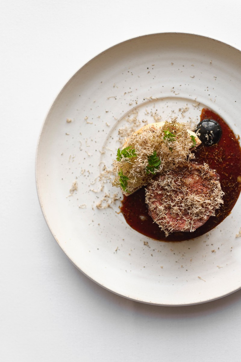 Everything is prettily presented on plates made by local ceramicist Cara Guthrie, who takes scraps and trimmings of vegetables from the kitchen’s compost and transforms them into ash that is blended into the clay used for each plate. It’s another example of the team’s approach to both form and sustainability – and sets the scene beautifully for the dishes that sit atop them.