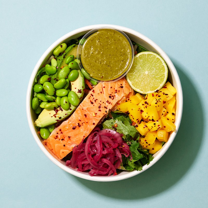 What’s Inside: Lightly roasted salmon on a bed of salad leaves and crunchy carrot and mooli slaw, with fresh mango, sliced avocado, edamame beans, coriander and pickled onions. Served with a pot of green dressing.
