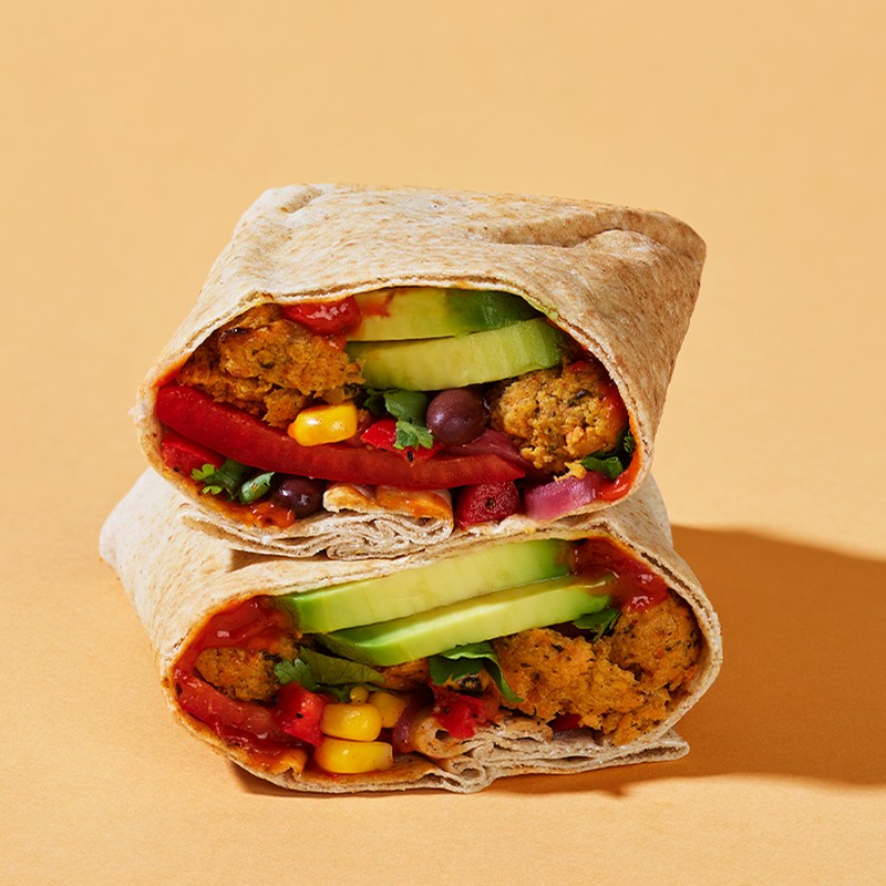 What’s Inside: Sweet potato falafel and freshly sliced avocado with chipotle ketchup, topped with pickled onions, red peppers, coriander and corn salsa. Wrapped in wholemeal flatbread.