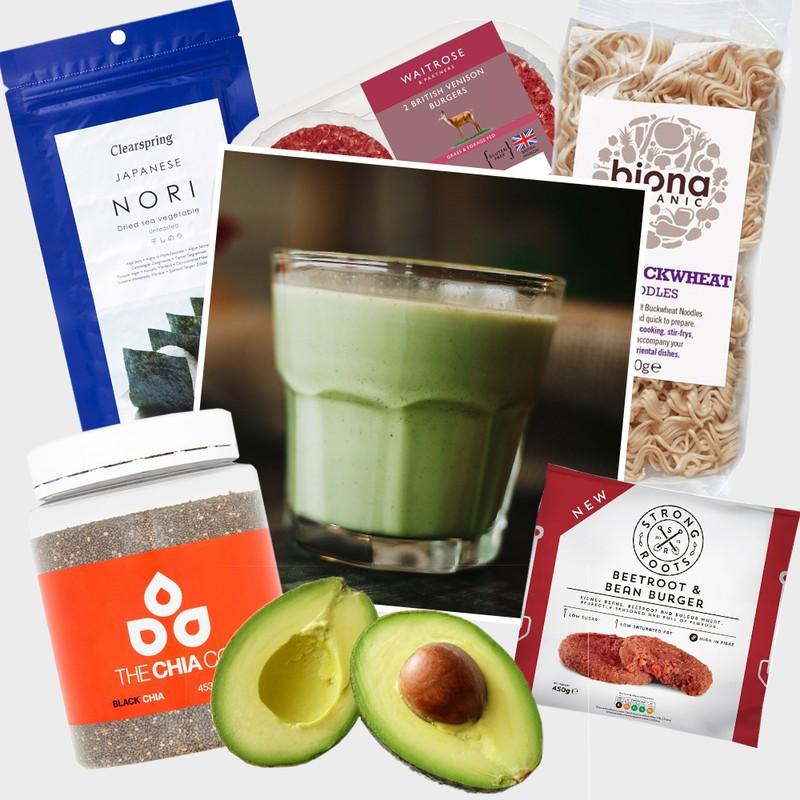 I order a Riverford Organic vegetable box every week. It’s full to the brim with greens. As well as this, I’ll always buy avocados, bananas, nuts, coconut oil, buckwheat noodles, chia seeds and matcha tea.