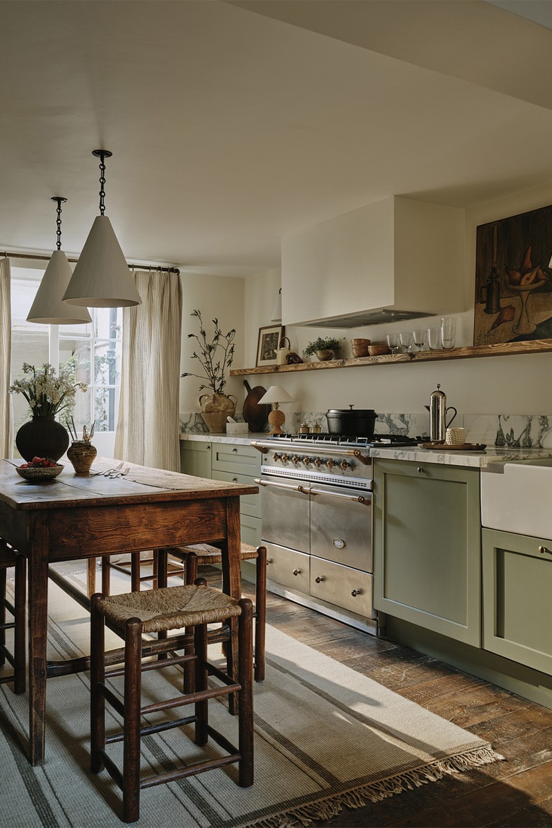 We retained the original kitchen carcasses for both sustainability and budgetary reasons, then added bespoke shaker-style doors painted in a soft olive green to nod to traditional joinery. The worktops and upstands were replaced with Calacatta Verde marble, chosen for its painterly movement and gentle green veining. Overhead cupboards were removed in favour of a single timber shelf, lending the space a more open and considered aesthetic. The extractor was boxed in and finished by hand in plaster so it would feel more architectural and less like an appliance.