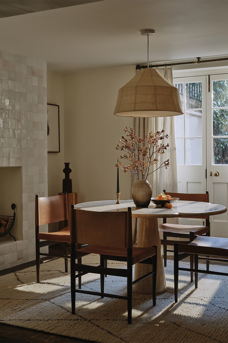 This space was conceived as an atmospheric, multifunctional room, designed to transition effortlessly from quiet dinners to larger, more convivial gatherings. The fireplace was reclad in off-white zellige tiles to add texture, depth and a hand-crafted finish to the room’s focal point. At the centre, a sculptural vintage travertine table lends softness through its curved edges, while grounding the space with its natural tone and weight. The dining chairs, in oak and warm tan leather, strike the right balance between elegance and informality. Elsewhere, a warm-toned wool rug introduces a soft geometric pattern and helps define the zone. Overhead, an oversized pendant shade diffuses the light, lending intimacy and a gentle glow.