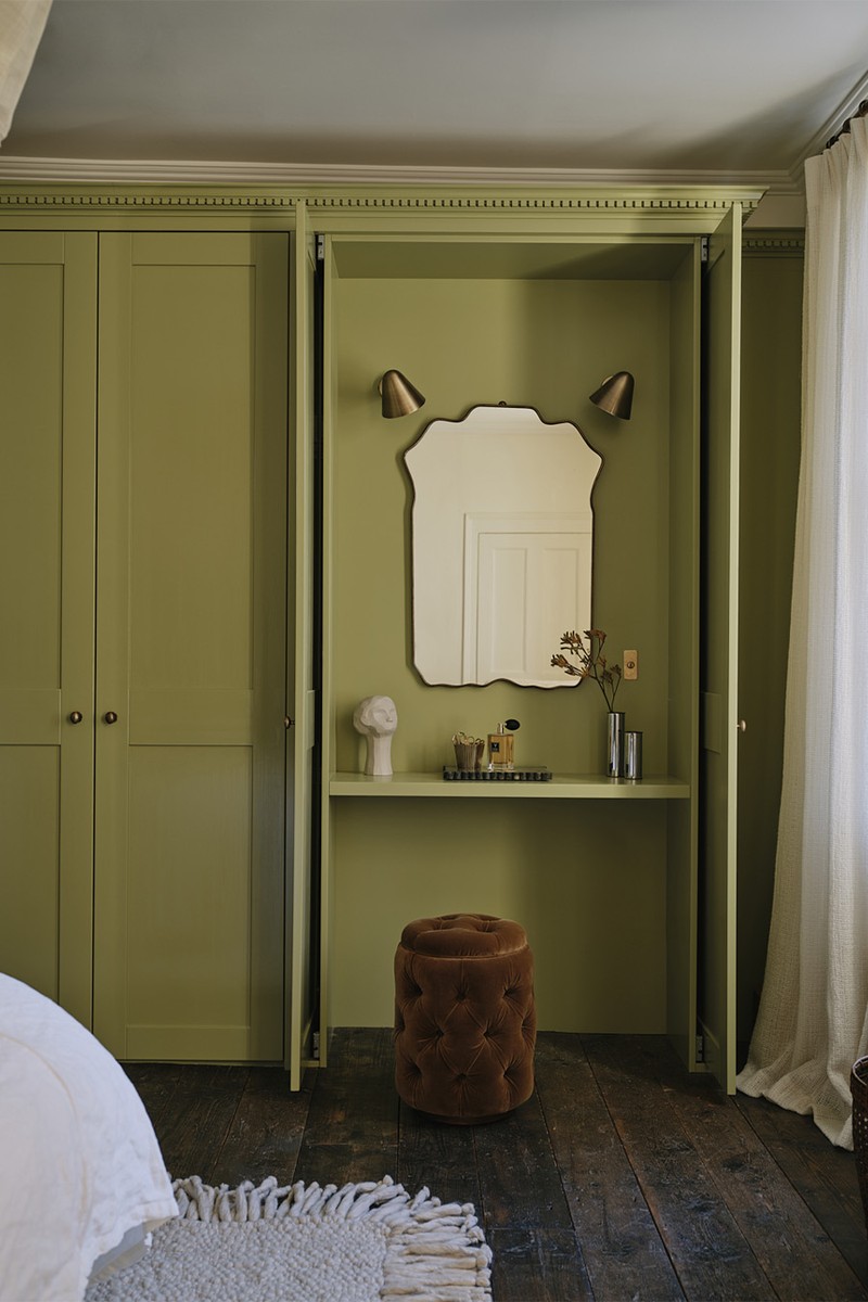 This was envisioned as a calm, cocooning space for rest and retreat – somewhere serene, grounded and timeless. Bespoke joinery spans one wall, cleverly integrating a concealed vanity unit. The cabinetry was painted in a punchy lime green – a vibrant counterpoint to the otherwise muted palette. Soft, textured curtains frame the tall windows and gently diffuse light throughout the day. A layered gauze ceiling light mirrors the drapery’s softness and the original timber floors were left exposed, grounding the space with their natural patina.