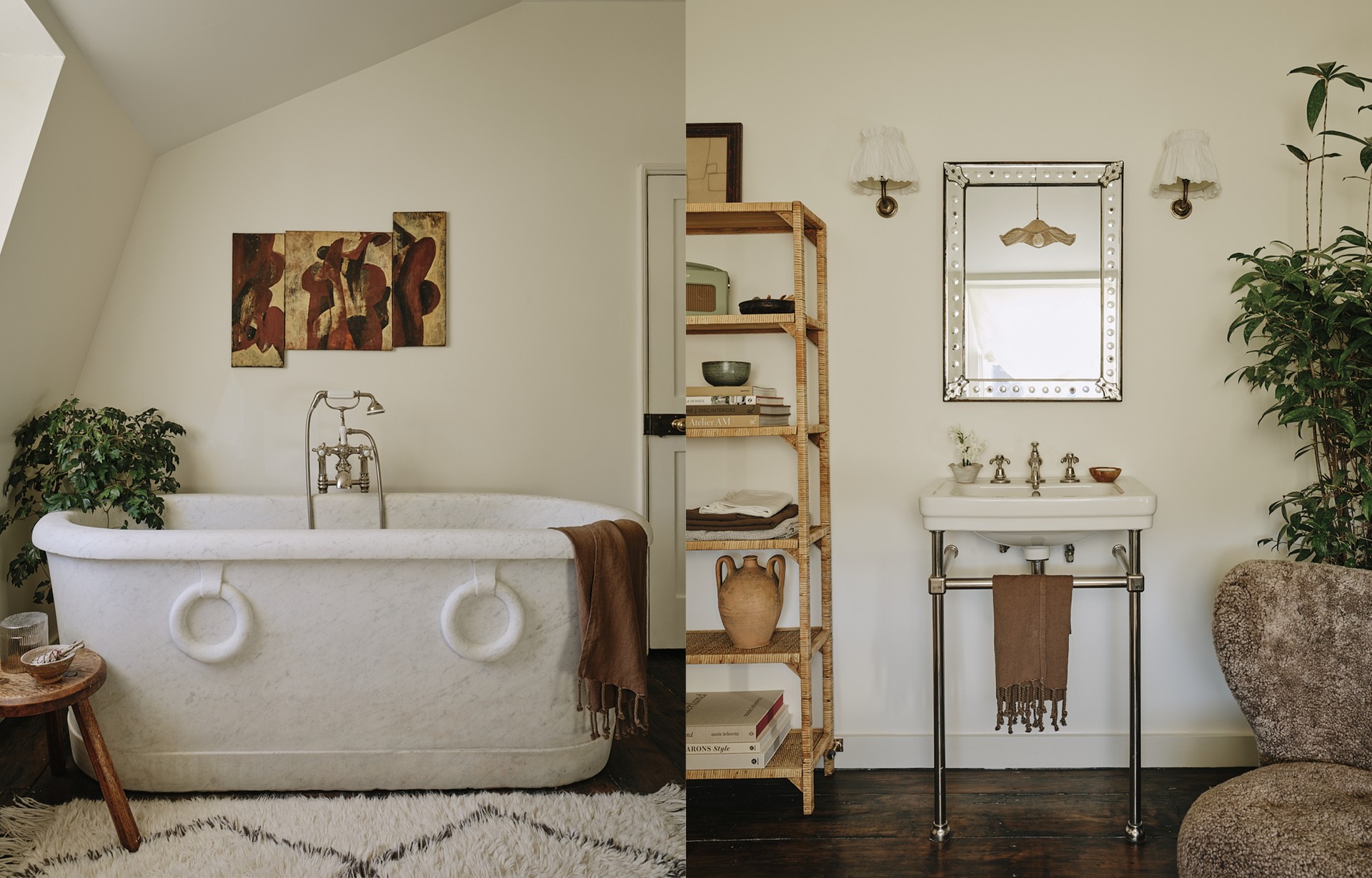 To balance its sculptural presence and soften the formality, we introduced a series of textural and tonal features, such as the deep shag pile rug and a sheepskin-upholstered lounge chair. We used natural elements, namely greenery and planting, to bring life and gentle movement into the space. A rustic milking stool serves as a perch for bath essentials, while tonal artwork above adds visual rhythm without dominating. Soft frilled wall sconces and a wavy rattan pendant add both charm and flattering light, and a rush-wrapped shelving unit provides tactile storage. Altogether, these additions transformed the bathroom from something stark or overly “precious” into a more welcoming space to truly dwell in, not just pass through.