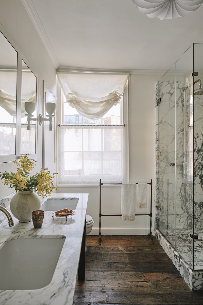 We retained the existing marble – both for sustainability and because its strong veining offered a dramatic base to work from. The original timber floorboards were kept exposed to balance the marble’s coolness with natural warmth. Lighting was layered to provide flexibility – a soft linen flush-mount on the ceiling combined with sculptural plaster wall lights at the vanity give the client the ability to control mood and brightness. Relaxed Roman blinds in a soft natural linen frame the windows, filtering the light gently throughout the day. Soft towel textures and a minimal palette of accessories keep the space feeling clean yet inviting.