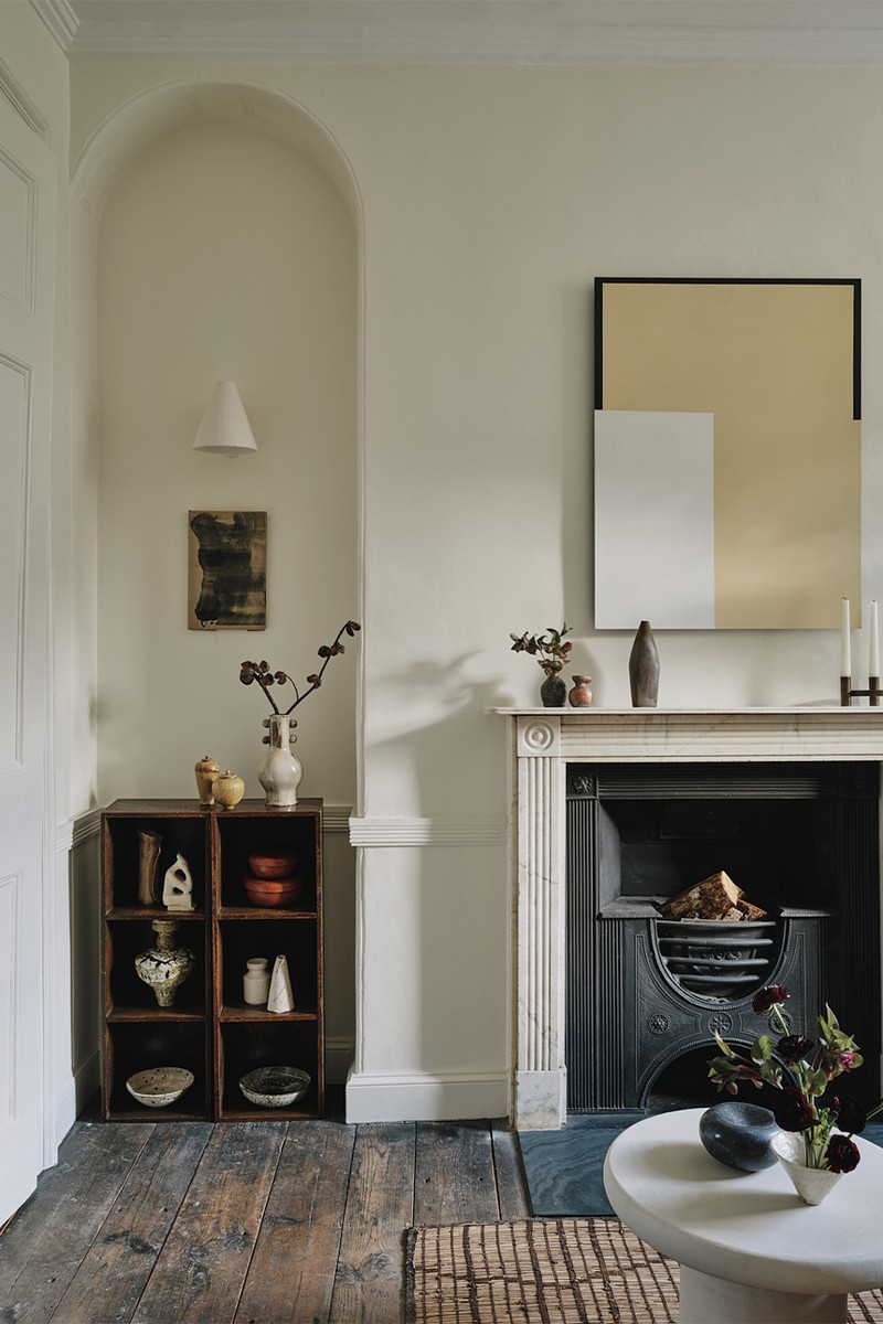 The original floorboards were maintained, retaining their aged character and tactile surface. Walls were painted in a soft off-white to keep the room feeling light and open, despite its compact size. A sculptural plaster side table introduces a handmade, organic feel and gently offsets the room’s symmetry. Lighting was kept low and layered – a vintage concertina wall lamp and recessed alcove plaster downlight add glow without glare.
