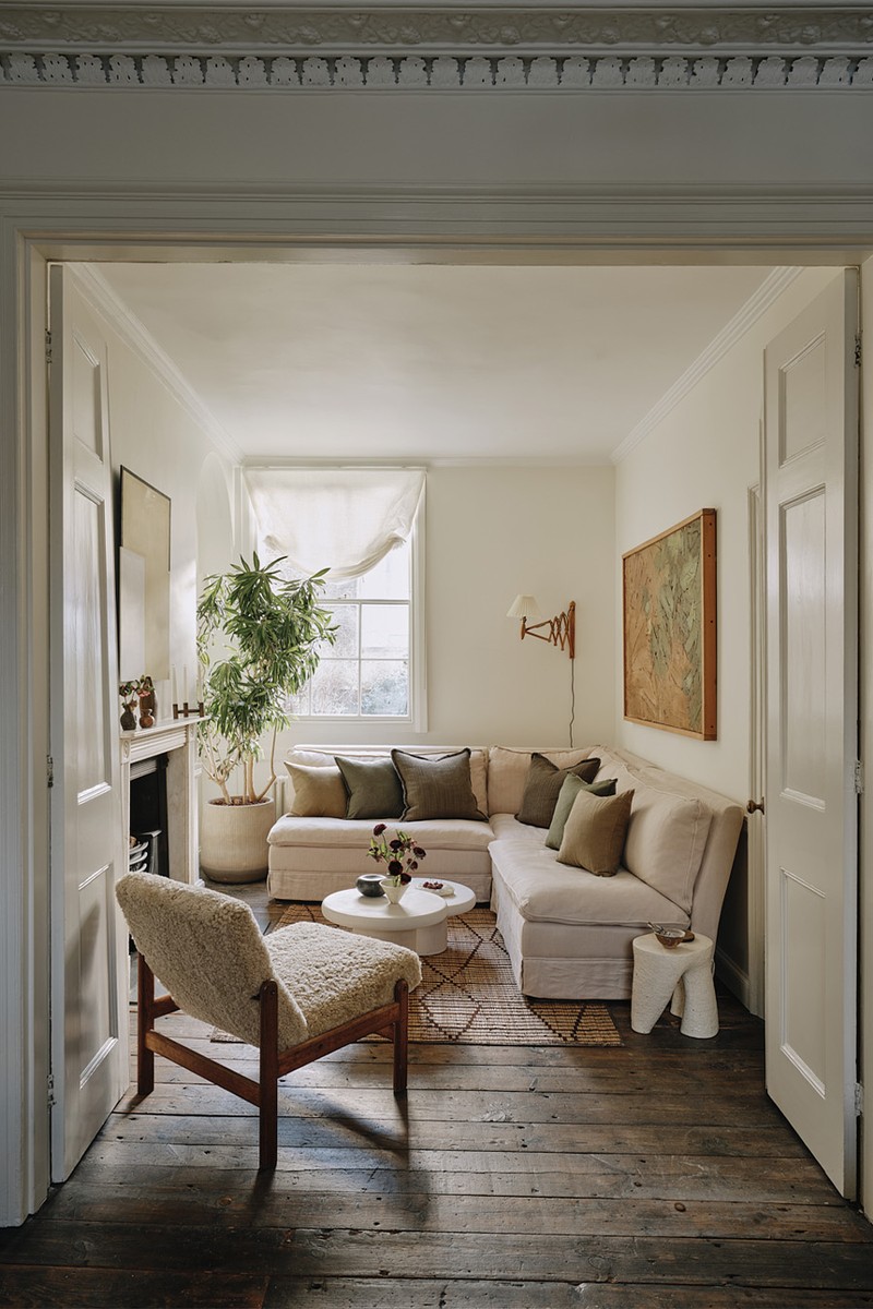 On the first floor, the living room enjoys the grandest proportions in the house – soaring ceilings, deep skirtings and tall sash windows. The brief was to create a space that felt warm and welcoming despite its scale, balancing the room’s inherent Georgian elegance with softer, more contemporary layers of texture and tone.