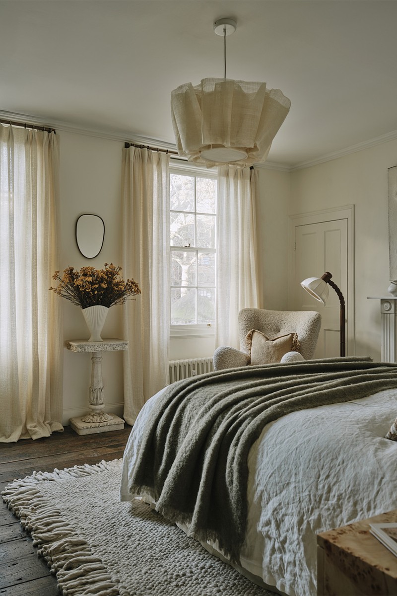 An upholstered headboard and layers of linen bedding set the tone for quiet luxury. The bed was dressed with tactile accents – a wool throw, fringed cushions and handwoven rugs – to bring material interest to the neutral base. In the corner, a vintage sheepskin armchair acts as a comfortable reading spot.