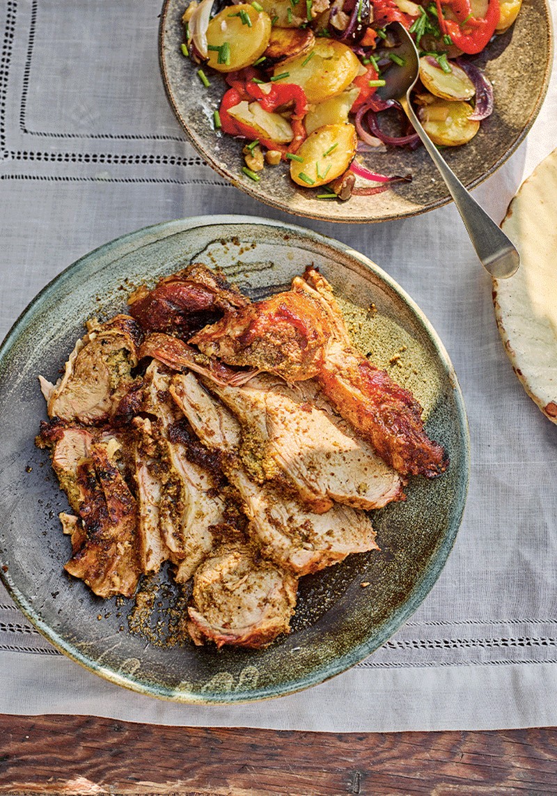 Place a drip tray in the centre of the BBQ below the grill, between the two areas of coals, to catch the fat. You want an initial temperature of about 200-220°C, which will then drop to about 170°C. You need enough coals for a good couple of hours’ cooking at about 170°C.
