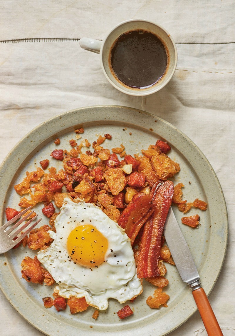 Once golden, stir the chorizo and garlic back into the bread chunks. Serve with the bacon and eggs.
