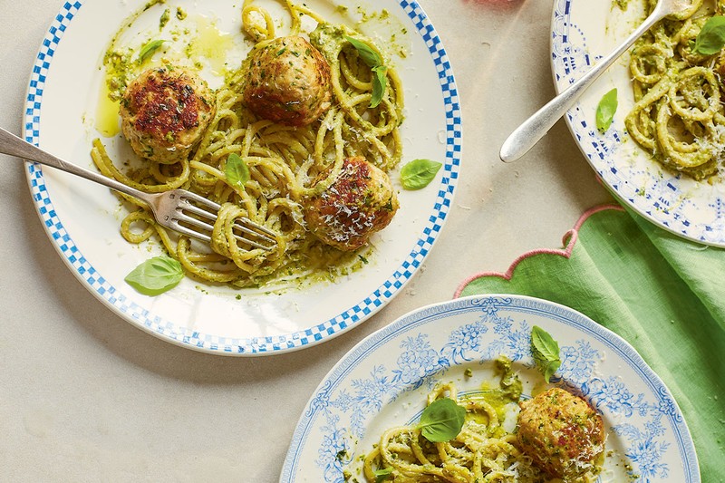 “While the meatballs cook, boil 400g of spaghetti in the salted water until just al dente, a couple of minutes less than the package instructions. Once the pasta is ready, use tongs to transfer it directly into the meatball pan, along with a ladleful of pasta water. Add the pesto and toss the spaghetti until it’s fully coated in the green sauce. If needed, add more pasta water to achieve a glossy finish. Adjust the seasoning if necessary. To serve, divide the spaghetti and meatballs between plates and sprinkle with the remaining 20g of parmesan for an extra touch of flavour.”