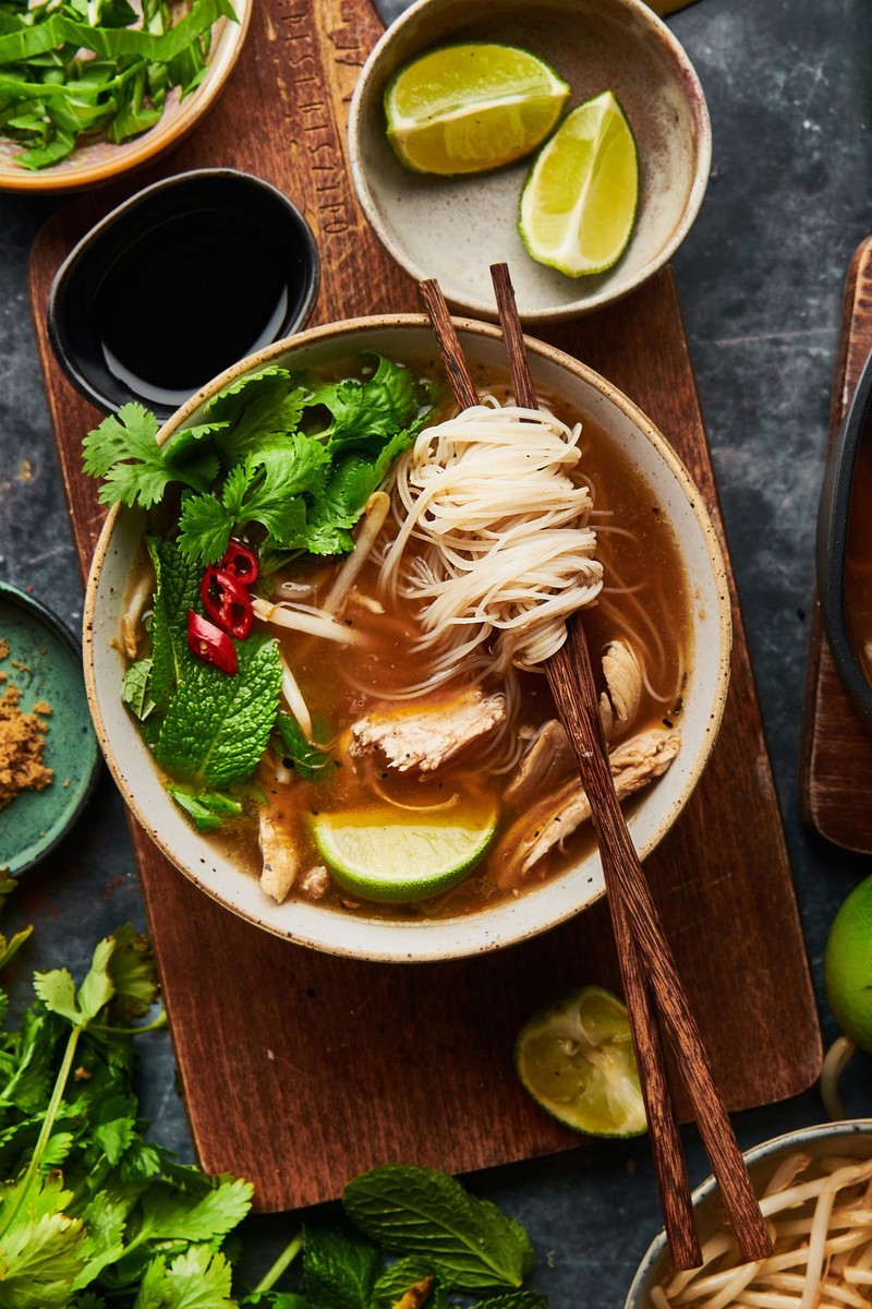 Once the pho has infused, strain through a fine sieve or muslin, then return to the pan together with the shredded turkey and simmer for 5 minutes, until thoroughly heated through.