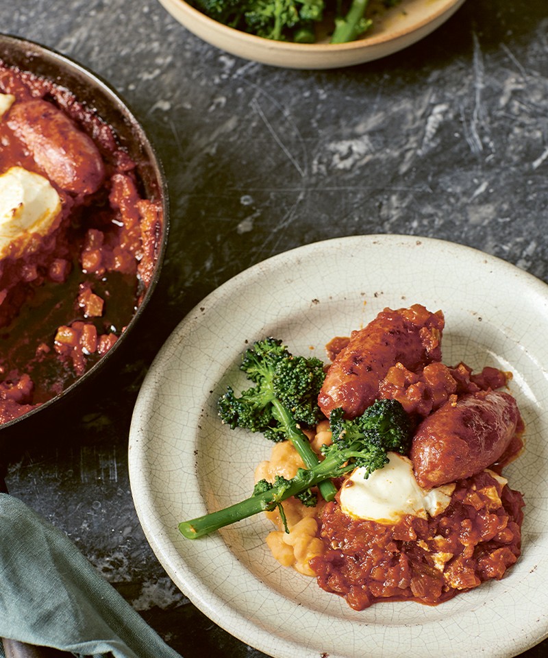 6. Place the sausages on top of the passata mixture and bake in the oven for 15 minutes, until the sausages are cooked through. Remove from the oven, dollop over the mascarpone and check the seasoning.