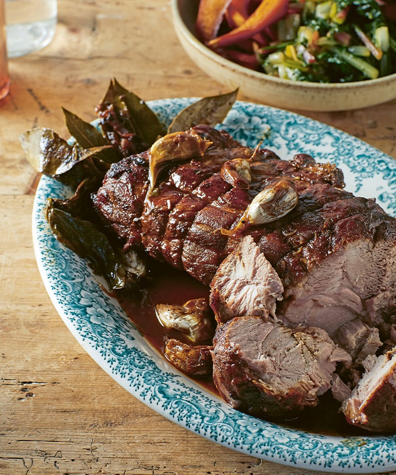 10. Serve the pork in the middle of the table with the sauce poured over (there’s no need to remove the bay and garlic – it’s all part of the charm). Carve the pork at the table and serve the squash and chard on the side.