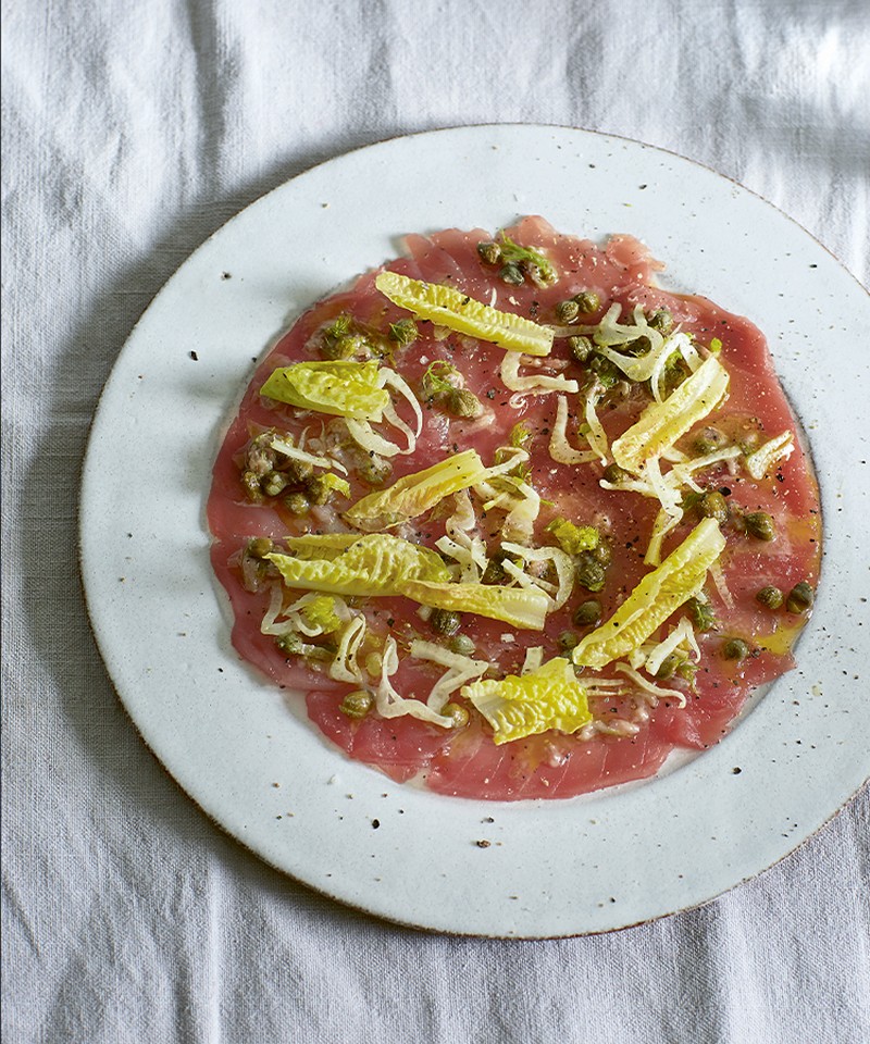 Popularised by Japanese cuisine, raw tuna is often served as a wonderful sashimi with soy and wasabi. In this Mediterranean version, the anchovies, capers and fennel provide heaps of flavour. It makes a perfect starter for a dinner party as you can plate the tuna well in advance, cover with cling film and refrigerate until your guests are seated. When you’re ready to serve, finish off with the sliced fennel, anchovies and capers. I’ve always thought the secret to a successful dinner party is to make it as effortless as possible.