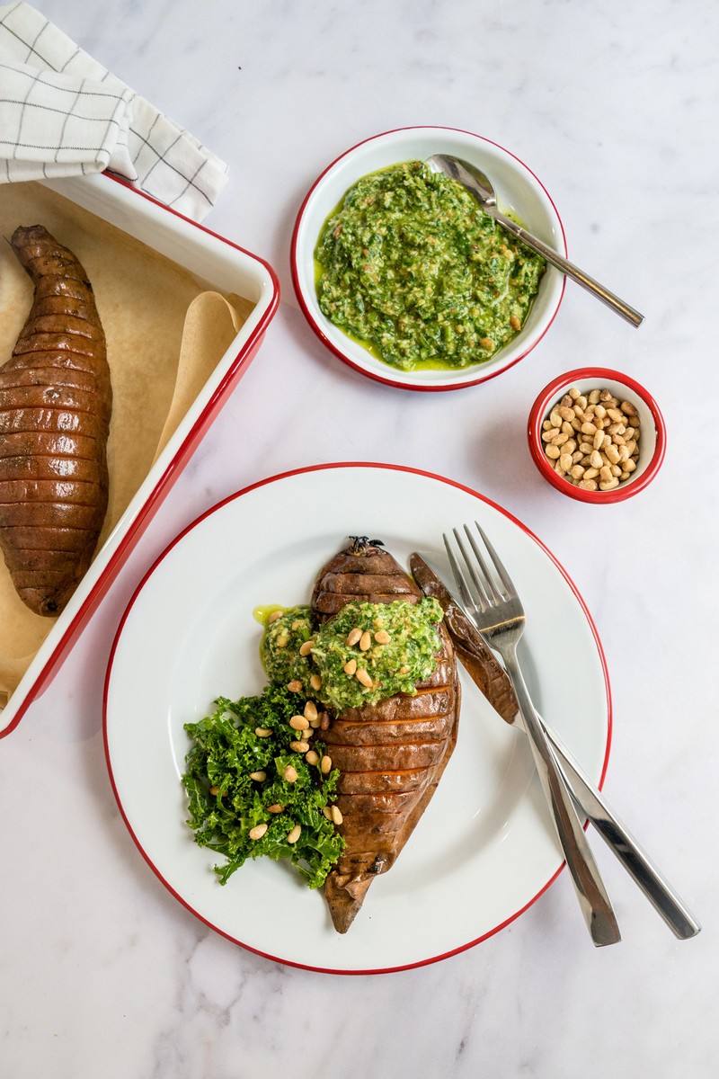 Hasselback Potato with Zero-Waste Pesto & Kale Salad