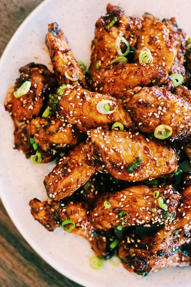Pour the sauce of the chicken wings and garnish with the sesame seeds and spring onion.