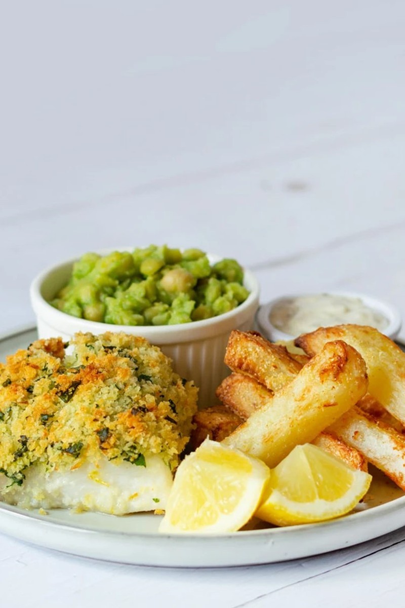 Meanwhile, place the bread, garlic, lemon, parsley and seasoning into a food processor. Blitz until you have fine breadcrumbs. Add the oil and pulse until mixed. Spoon the breadcrumb topping onto each cod fillet and press it down with the back of spoon.