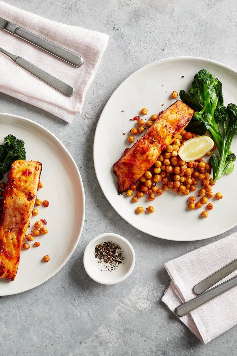 Preheat the air fryer to 180°C. Rub a tablespoon of harissa paste over each salmon fillet with the back of a spoon.