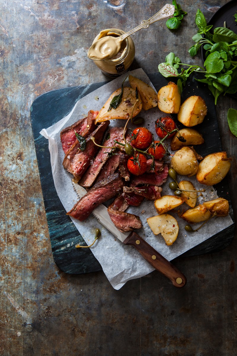 I like cooking with dry-aged beef. Start by seasoning with salt and pepper to draw out the moisture, pat dry, sear and brush with English mustard, salt and pepper again, before roasting in a trivet. This will be the base for your beef jus.