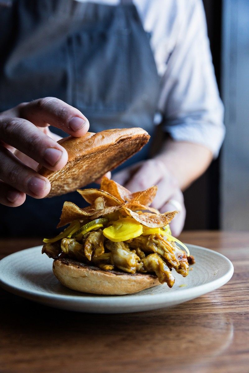 “Mash roast potatoes, leftover veg and stuffing together with a fork or a potato masher. Add a beaten egg and mash again. Season and form the mix into a small patty-like burger. Refrigerate for at least half an hour. This will stop it falling apart when you fry it later. For the slaw, slice 2 leftover sprouts and a few leaves of cabbage as finely as possible. Put them in a bowl and grate a small carrot in there too. Whisk 1/3 lemon juice to 2/3 olive oil, add a good pinch of salt and toss it through the veg. Set the bowl aside to soften. For the gravy mayonnaise, heat 4 tbsp of leftover gravy in a pan and boil until reduced by half. Beat it, hot, into the mayo. It'll look weird at first but keep beating – it will all come back together. Put your leftover meat in a pan, add a splash of water and a touch of vinegar and heat it up. Cut an English muffin in two and toast the insides under the grill. Meanwhile, fry the patty in a medium-hot frying pan. Do not be tempted to turn it too quick, let a crust build up and then flip it. Heat some more leftover gravy up in a pan and keep it nice and warm. To assemble, slather the insides of your muffin with the gravy mayo. Put a good heap of hot meat on the bottom. Squish the patty on top of that. Crush some crisps and sprinkle them all over the mayo side of the muffin. Put the slaw/salad all over the patty. Tip your extra gravy on to a saucer to dunk your sandwich in. Serve.”