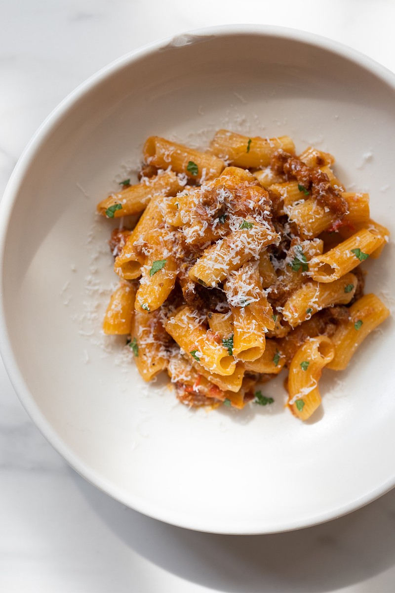 It's a versatile ingredient, but there are definitely rules – especially where Italians are concerned! In general, long and thin pastas such as taglierini or linguini work best with a light sauce and delicate ingredients. I’d pair these with the likes of truffle, crab and clams. Because these pastas have less bite, they let these more delicate ingredients sing. Tube pastas such as rigatoni work well with a ragù because the pasta is more substantial and can withstand being worked with the ragù to emulsify the sauce properly. Thick sauces also work well with something like bucatini and rigatoni, as the sauce makes its way into the middle of the pasta. There are definitely traditions Italians stick to when it comes to pairing sauces with pasta – pairing spaghetti with bolognese sauce wouldn’t be the done thing – but as long as you enjoy the taste, that’s the main thing.
