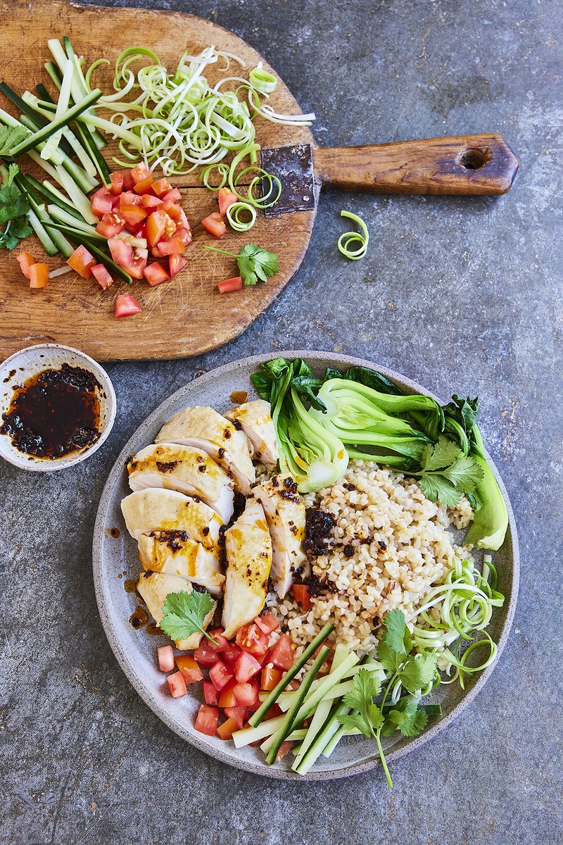 Take the chicken breast off the bone and cut into thick slices. Pull the thigh and leg meat away from the bone. Season the rice with a little extra tamari or soy sauce, if needed. Serve the chicken with the rice, choi sum, tomatoes and cucumber, drizzled with the chilli oil. Garnish with the spring onions and coriander.