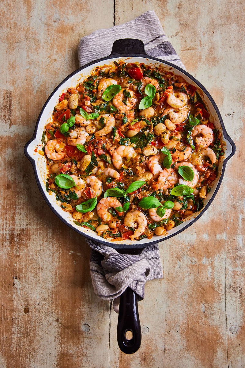 Add the beans to the sauce and place the prawns on top. Simmer for 2 minutes then transfer to the grill for 4 minutes to finish cooking the prawns and caramelise the top of the dish.