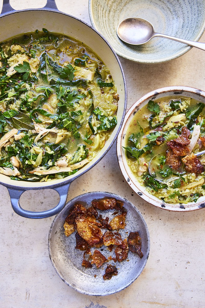 Ladle the soup into the bowls and top with shards of the crispy chicken skin, if you like.