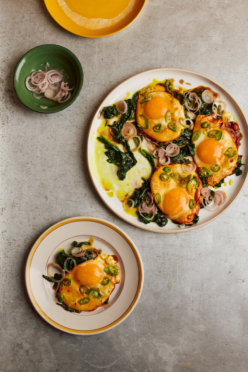 When ready, use a spatula to transfer the eggs to the plate of spinach, drizzling with any extra turmeric oil in the pan. Top with the pickled shallots and then drizzle with some of the tamarind dressing, serving any remaining alongside.