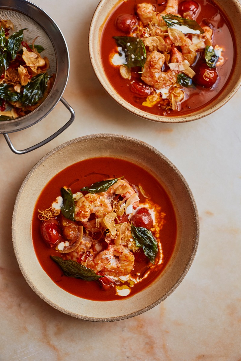 Heat the oil in a large sauté pan, for which you have a lid, over a medium-high heat. Add the tomato paste and prawn heads and shells and cook, stirring occasionally, for 3 minutes or until deeply red. Add the garlic, ginger, lemongrass, lime leaves and chillies, and cook for a minute more, until fragrant. Add the coconut milk, cream, 450ml of water and 1 teaspoon of salt, bring to a simmer, then turn the heat down to medium-low, cover with the lid and leave to cook for 25 minutes. Strain through a sieve set over a large bowl, pressing down on the solids to extract as much flavour as possible (discard the solids, or save them for another use). Rinse out the sauté pan; you’ll use it again later.