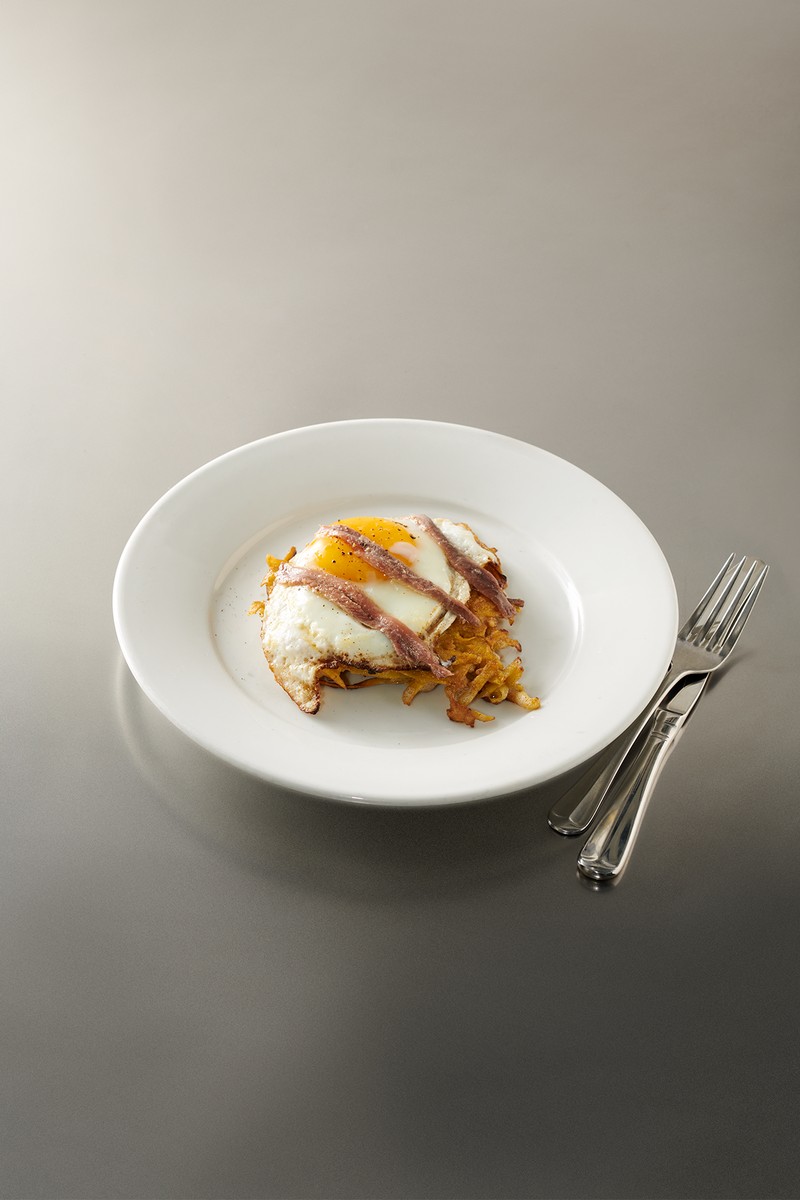 Place 1 warm rosti on each of 4 plates, then top each one with a fried egg and 3 anchovies. Finish with a grinding of black pepper.