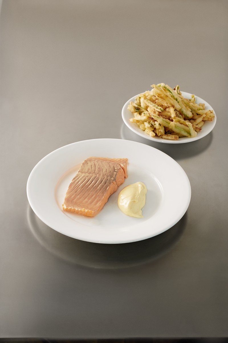 When the trout is nearly cooked, cut the courgettes into matchsticks to resemble thin fries (think McDonald’s). Put the sticks into a bowl and coat with the batter.