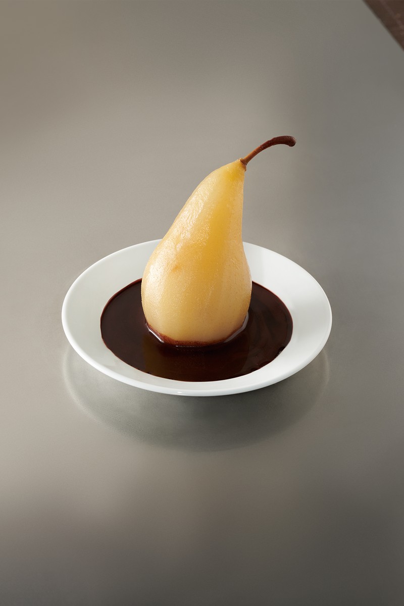 To serve, cut across the bottom of each pear to create a flat edge so they can stand upright. Divide the warm chocolate sauce between 2 plates, then place the pears on top and serve immediately.