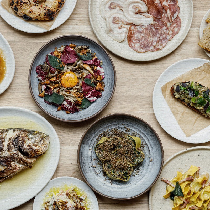 Manteca has opened its first permanent restaurant. Its Shoreditch venture centres on a glass-panelled hanging room for Chris Leach and his team’s in-house butchery and salumi. Lunch and dinner kicks off with these freshly sliced meats, which include fennel pollen salame; black pepper and lambrusco salami; coppa; ’nduja; and sticks of coppiette, a Roman-style pork jerky cured with Campari and fennel seeds. Among the starters are ’nduja-steamed mussels with cream, parsley and sourdough; and clam flatbread made with ancient grains. Pastas include brown crab cacio e pepe (a hit from the pop-up) and tagliatelle with smoked seaweed butter. Larger dishes cooked over fire are designed to be ordered and shared family style – think thick-cut Oxford Sandy pork chop and wood roasted sea bream. To drink, there’s a concise selection of aperitivi and amaro cocktails, mixed using the in-house amaro, made with artichoke leaves and chamomile.