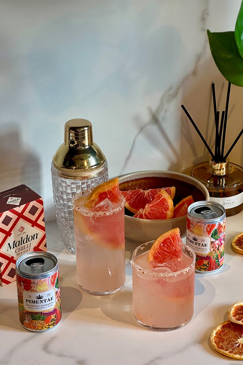 Fill the glass with ice, then pour over a can of Pimentae's Grapefruit Margarita, a smooth but vibrant blend of tequila, pink grapefruit and agave.
