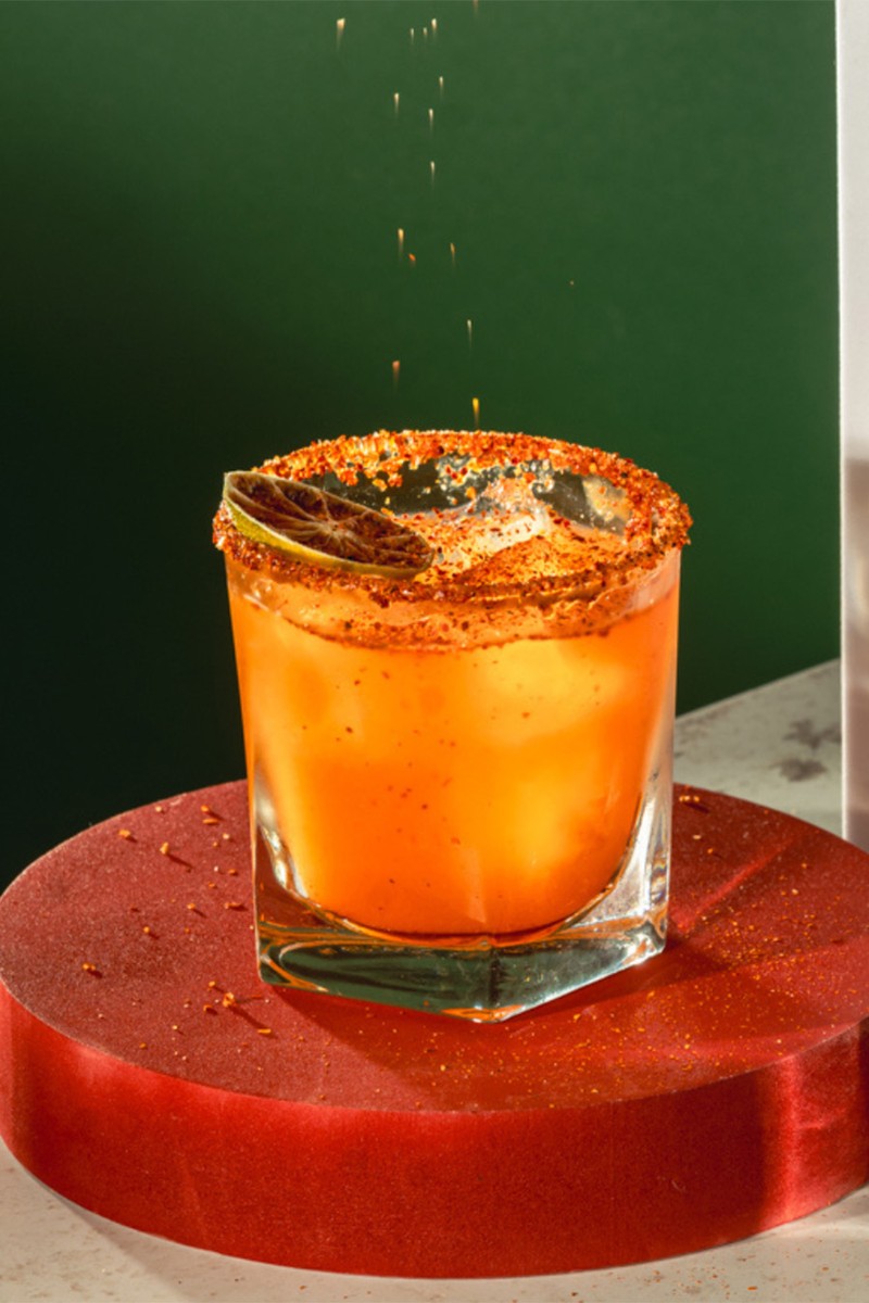 Prepare your glass by rimming half of it with Tajín for a hit of spice.