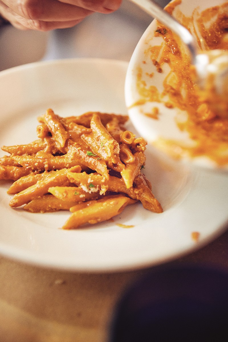 I first had this dish at the cult restaurant Alla Vecchia Bettola on a busy corner by a main road on the outskirts of Oltrarno in Florence. It’s one of those slightly kitsch recipes that was popular in the 1980s and which has been enjoying something of a revival in Italy and even now in New York. Despite the potentially gimmicky nature of the addition of vodka, it works exceptionally well and is a favourite at Brutto. Most supermarket penne is rigate – with ridges. If you can find penne lisce – smaller and without ridges – this makes a much more authentic version of this dish.