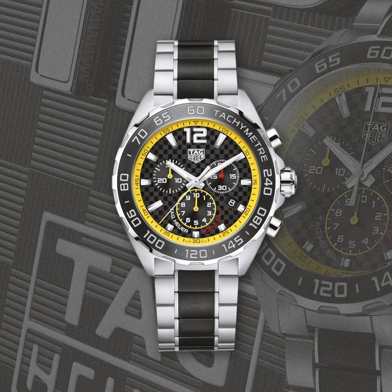 This slick new timepiece is built for speed with a racy carbon fibre-textured dial as well as a 60-second/minute scale flange and central hand tip in bright yellow. The racing bracelet is in fine-brushed and polished steel and ceramic, while a special ‘Driver’ extension makes it wearable over the sleeve of a racing suit – or just, you know, a jacket.