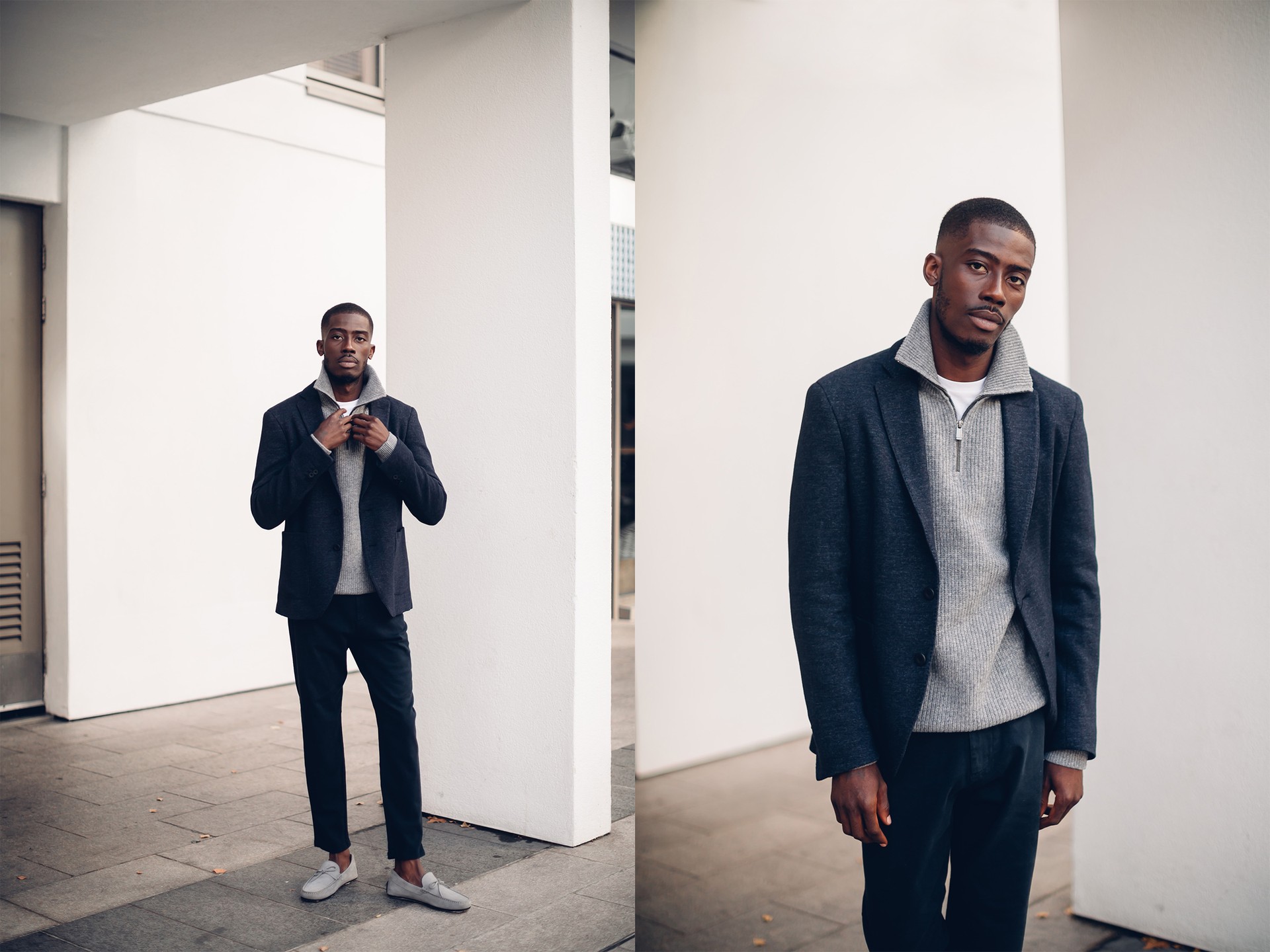 Strike the right high/low balance with a blazer, loafers and a casual knit.