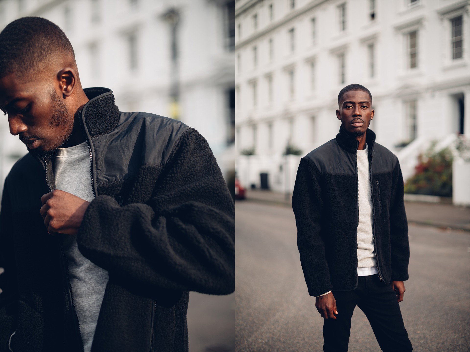 A fleece bomber will stand you in good stead this season. Cool trainers and a grey sweatshirt complete the look.