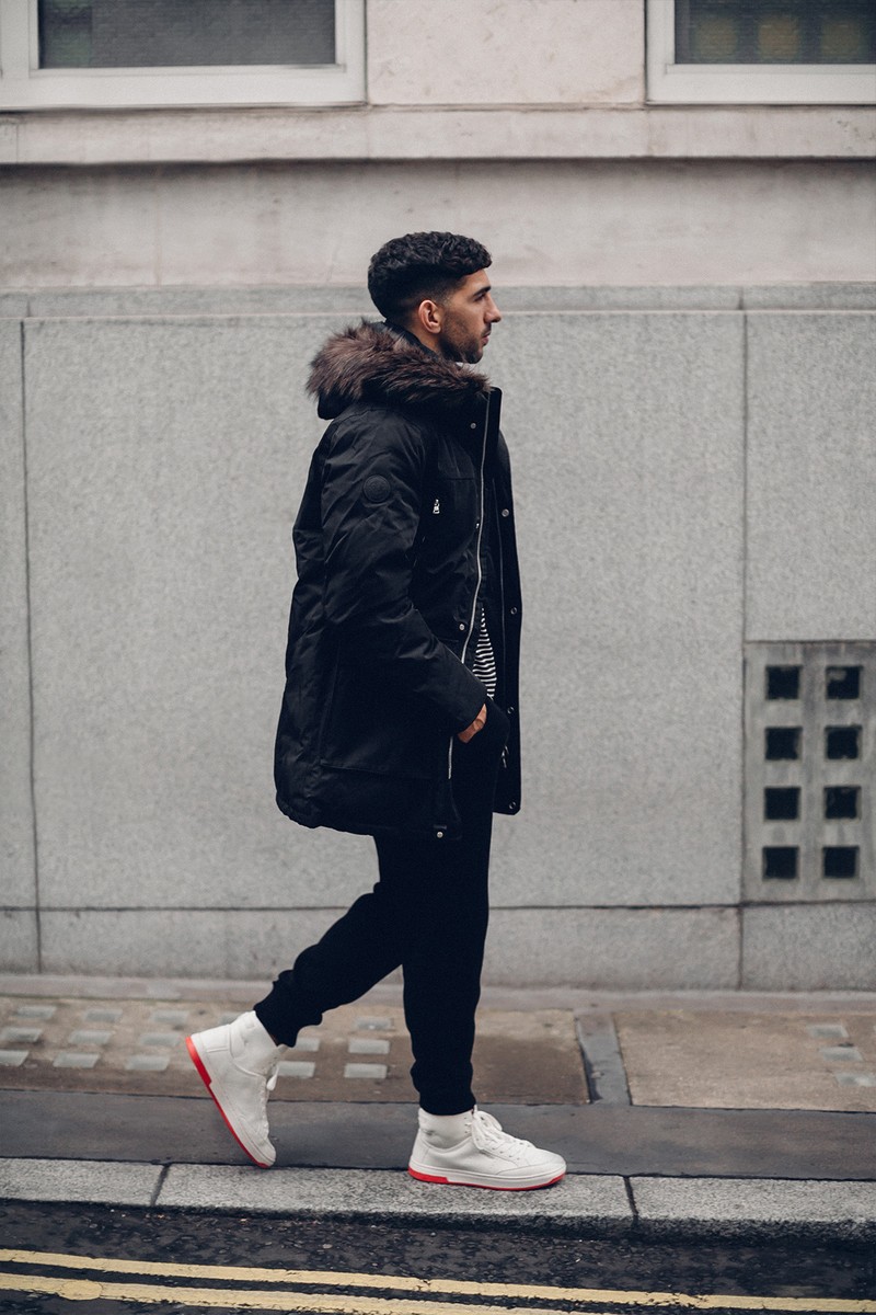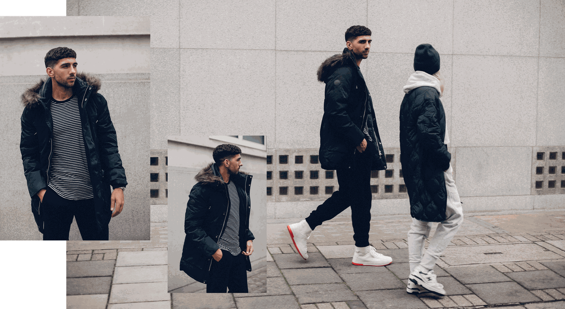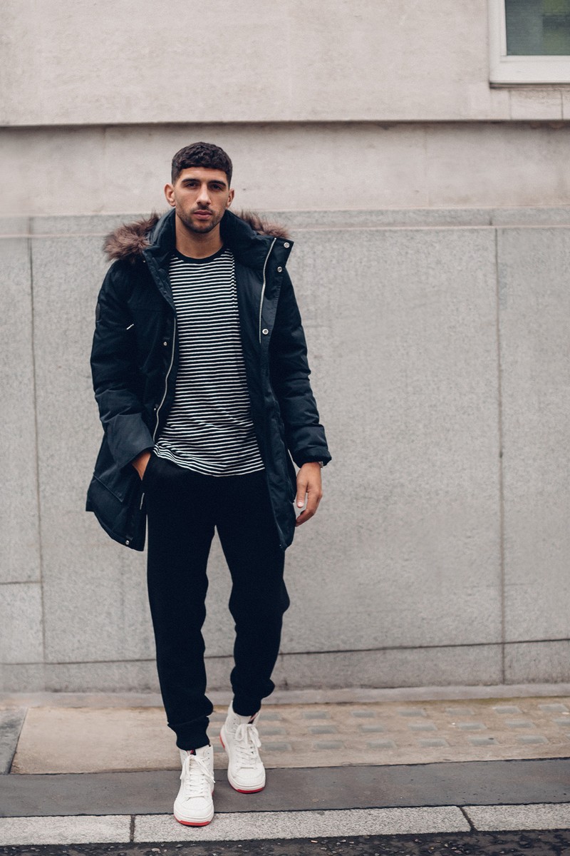 Marvin Wears: Everest Down Parka Coat, £299.99 | Studios Essential Joggers, £49.99 | Long Sleeved Heavy Weight Stripe Top, £29.99 | Vegan Retro Sleek Trainers, £54.99