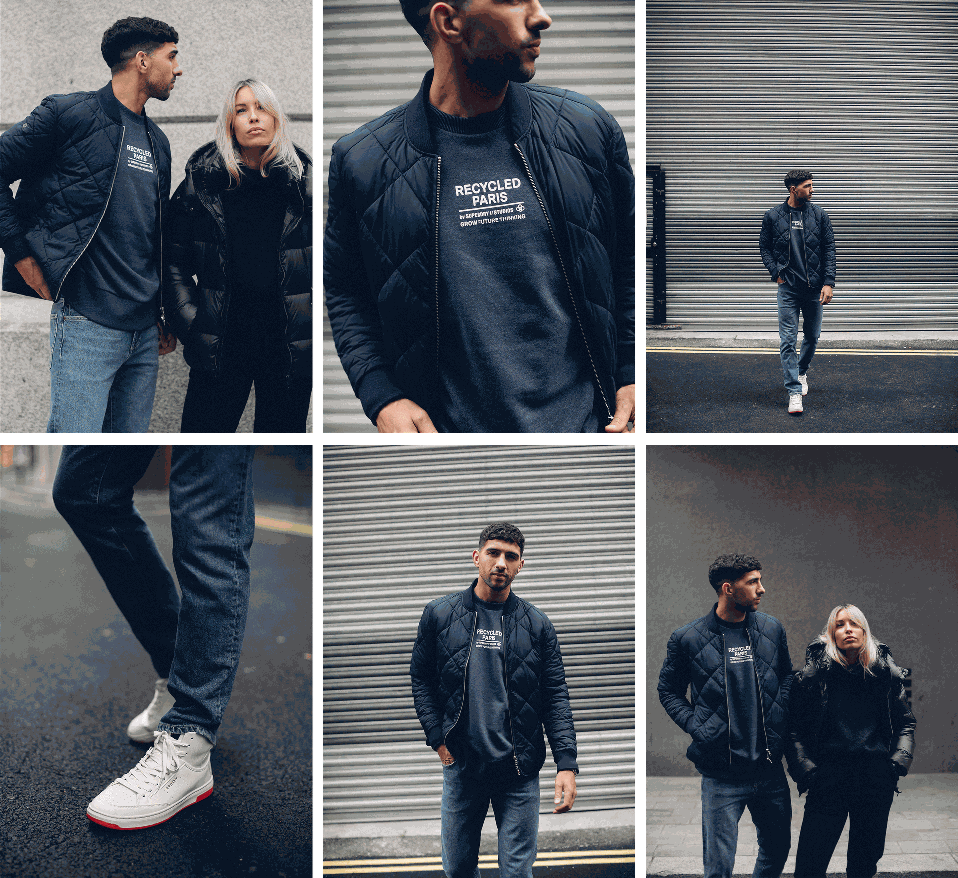 Stick to a tonal palette in navy, black, white and stripes for easy everyday style. Try the brand's stylish, 100% recycled sweat collection to complete your look.