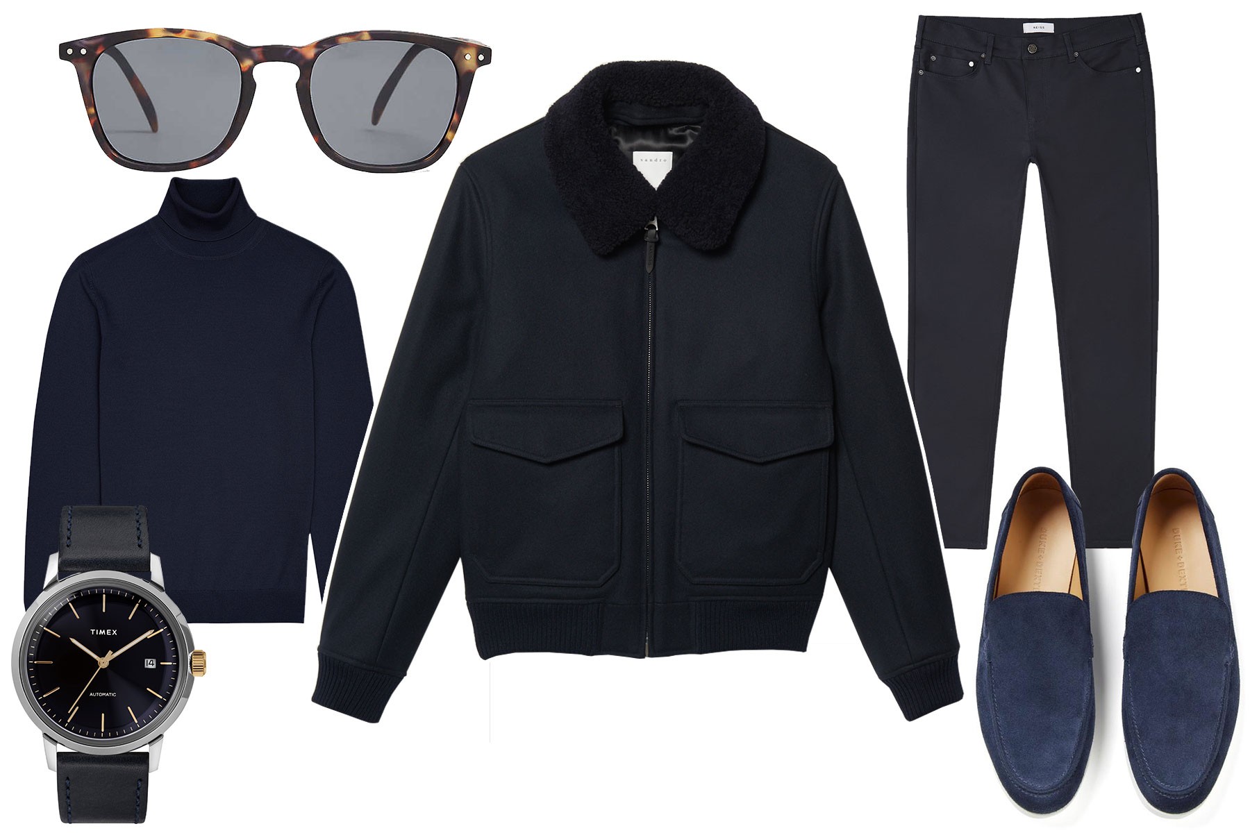 An all navy bomber jacket looks even smarter when teamed with navy chinos, loafers and a navy roll neck. Break up the block colour with a pair of cool tortoiseshell sunglasses.