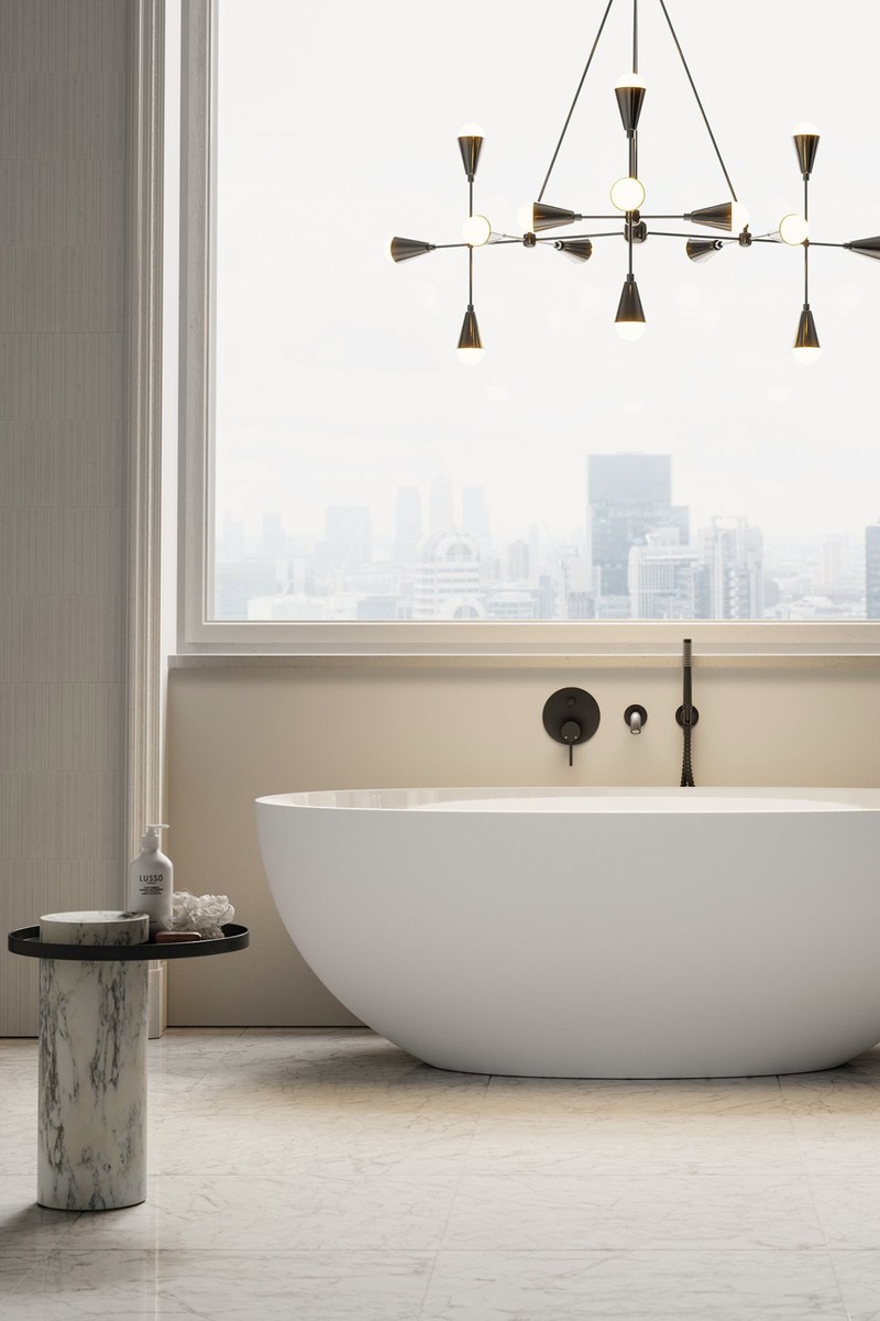 Lusso’s service is incredible – and they’ve won loads of awards to prove it. This sums up my love of wanting a traditional feel, but going for a modern take. It’s the same shape as a Victorian bath, but in stone, which is hard to find. Then we’ve got the matching sink in marble. I think it weighed about 80kg and it took three guys to get it up the stairs. No one else does it like Lusso – they really wanted to help me find the best pieces. They also make beautiful brushed-gold taps, which we’ve used throughout the house. They’re not garish like they sound, and the Greek part of Steph loves them.