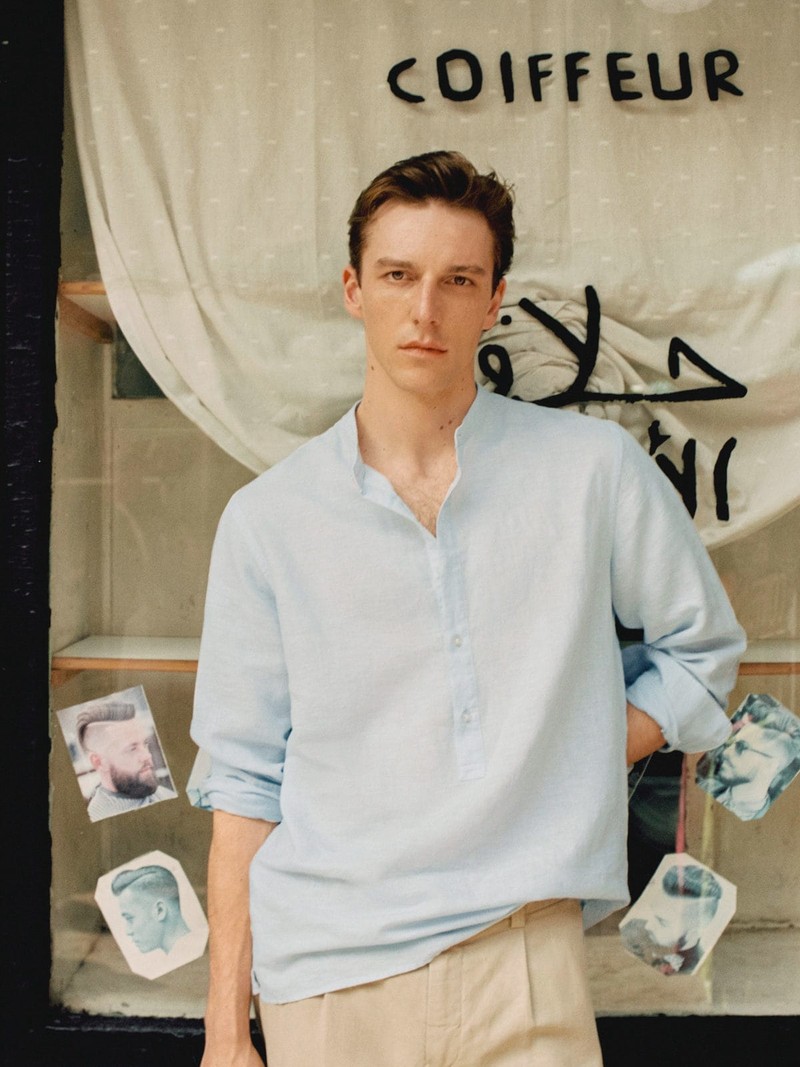 Mango has nailed off-duty shirts. This soft-blue grandpa style is ideal for layering – try with a spring blazer for a smart-casual look.