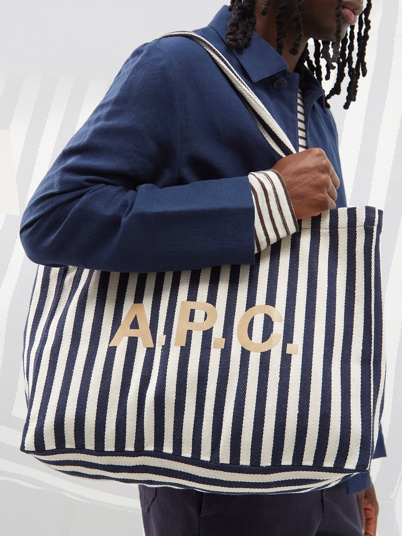 A statement tote will add interest to any outfit, and this APC bag is as stylish as it is practical. Keep the rest of your look super simple – a grey marl tee and beige chinos are all you need.
