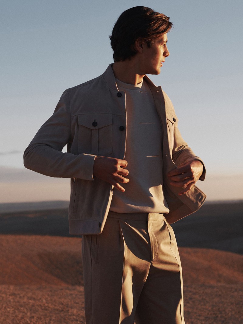A khaki jacket is borderline essential at this time of year. Style with a striped t-shirt, loose chinos and some classic white trainers.