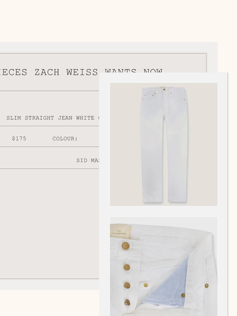 I wear white denim year round, and my favourite fit is from American menswear hero Sid Mashburn. I’ve got at least five pairs that I have hemmed to different lengths, and some that have great mud stains at the cuff from my travels.
