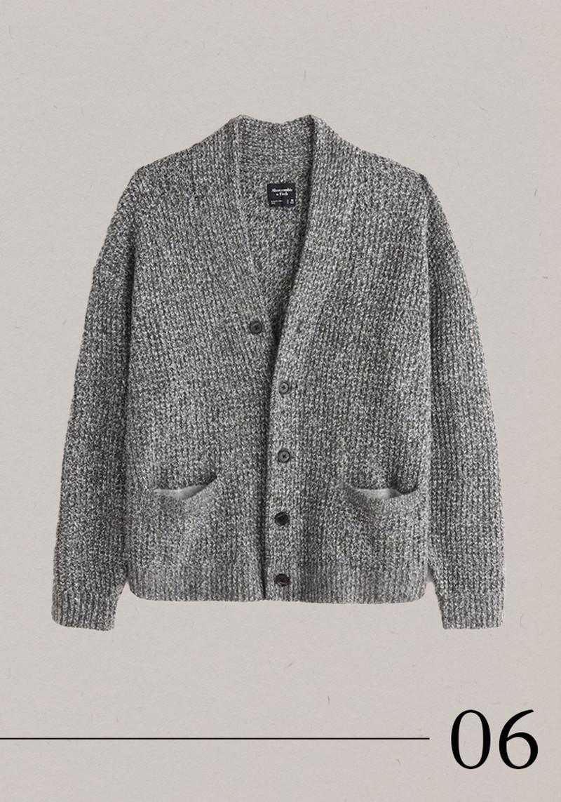Layer up in style in this cool chunky cardigan. Elegant types should add black denim, a tee and smoking slippers for a polished evening look.